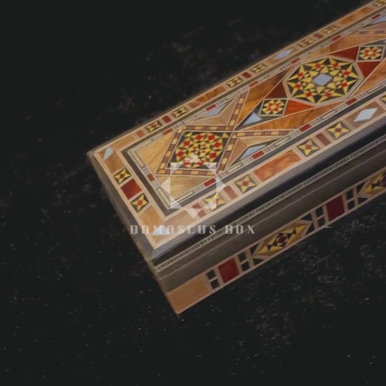 كلمات مفتاحية: صندوق موزاييك خشبي يدوي، علبة مستطيلة طويلة بتطعيم لؤلؤ، صندوق أقلام دمشقي، صندوق مجوهرات شرقي، علبة خشبية فاخرة، تطعيمات هندسية عربية، صندوق فني، صندوق هدايا سوري، صندوق للنساء، صندوق للرجال